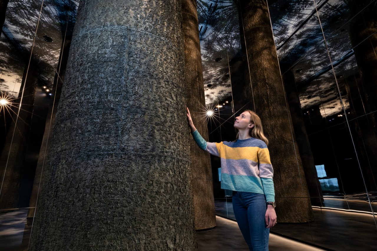 The exhibition begins as visitors enter an immersive forest of towering bunya trees. Mirrors on either side of the space create an infinity effect. Planned enhancements will allow visitors see themselves walking among these ancient, giant trees, touch the timbers, and feel vibrations emanating from within.