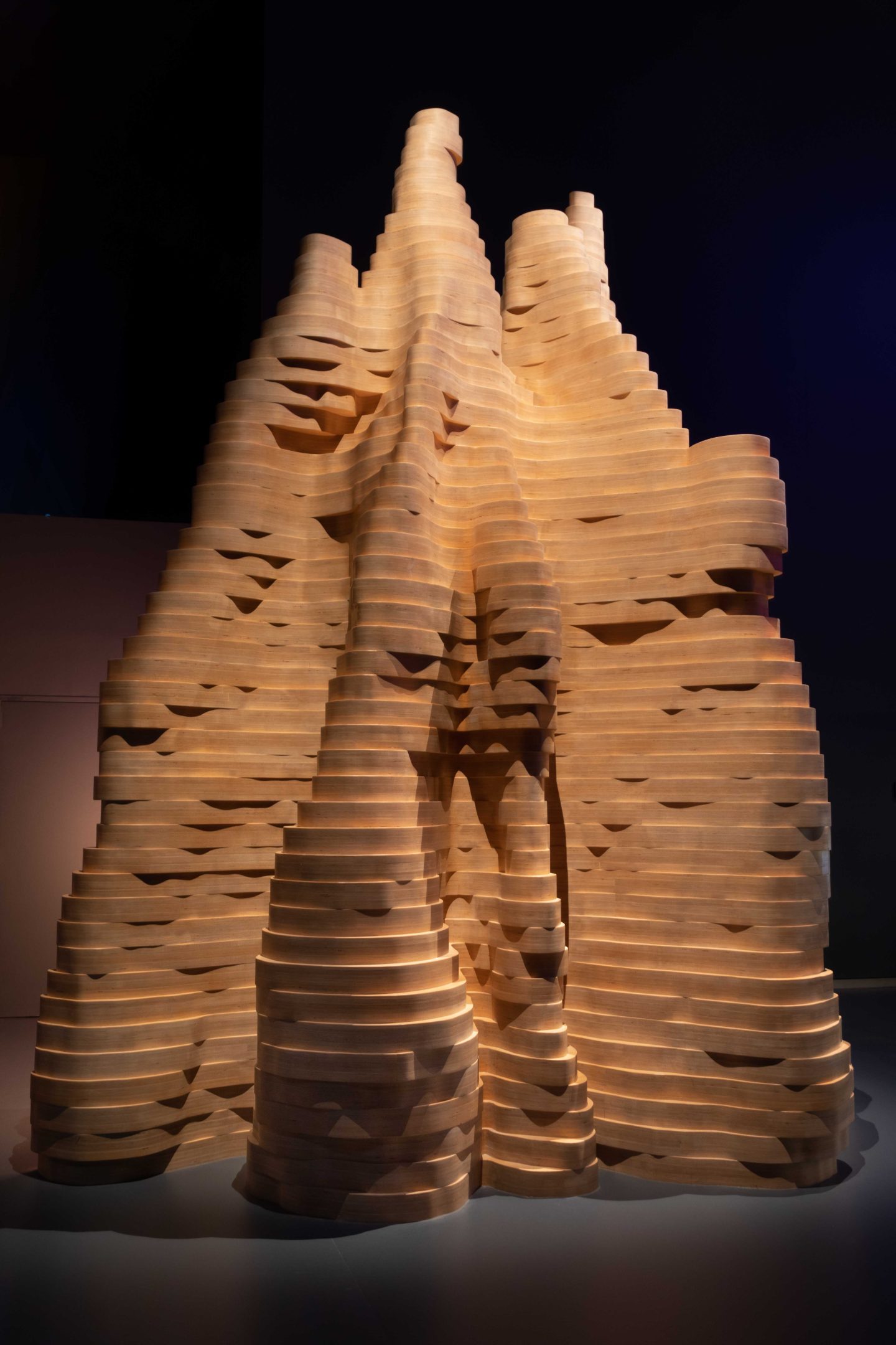 The exhibition begins as visitors enter an immersive forest of towering bunya trees. Mirrors on either side of the space create an infinity effect. Planned enhancements will allow visitors see themselves walking among these ancient, giant trees, touch the timbers, and feel vibrations emanating from within.