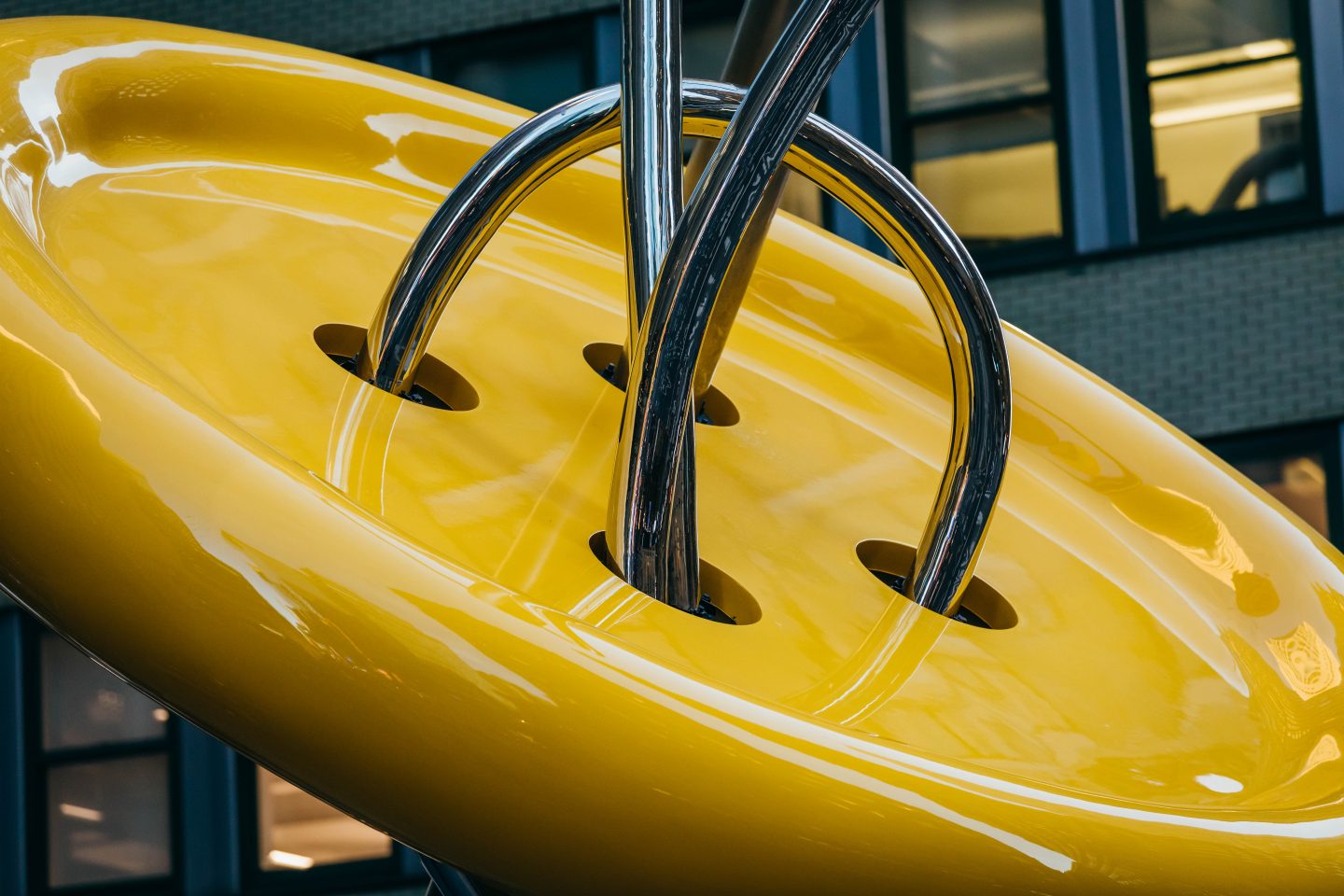 Our approach creates the illusion of the overscaled button upheld by a single stainless-steel thread that supports a 32-foot stainless-steel needle, and a button that has been recast and changed from a dark black to a bright yellow. The color change is an homage to the color scheme of the early 1900s transit system that carried many Garment District workers from their homes in Brooklyn and Queens. It also evokes the iconic yellow taxi cabs that reflect the hustle and bustle of city streets, pops against the gray, monochromatic surroundings, and stands out on the dreariest of days.